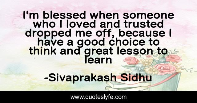 This page presents the quote "I'm blessed when someone who I loved and trusted dropped me off, because I have a good choice to think and great lesson to learn". Author of this quote is Sivaprakash Sidhu. This quote is about love-cheat, hurting, sivaprakash-sidhu, lessons-learned-in-life, lesson-for-life, sivaprakash, thinking-with-a-great-mind, choice, sivaprakash-gopal,.