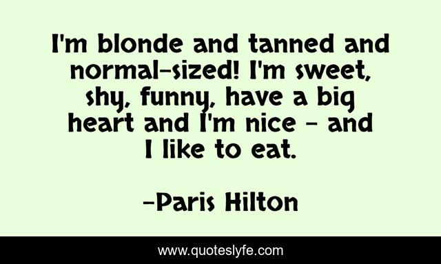 This page presents the quote "I'm blonde and tanned and normal-sized! I'm sweet, shy, funny, have a big heart and I'm nice - and I like to eat.". Author of this quote is Paris Hilton. This quote is about heart, sweet, nice,.