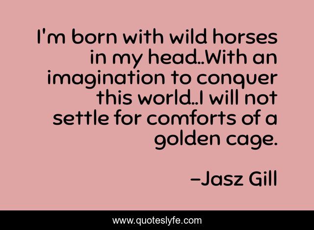 This page presents the quote "I'm born with wild horses in my head..With an imagination to conquer this world..I will not settle for comforts of a golden cage.". Author of this quote is Jasz Gill. This quote is about confidence, positive, motivational, zen, inspirational-attitude, sufism, optimistic, inspirational, enthusiasm,.