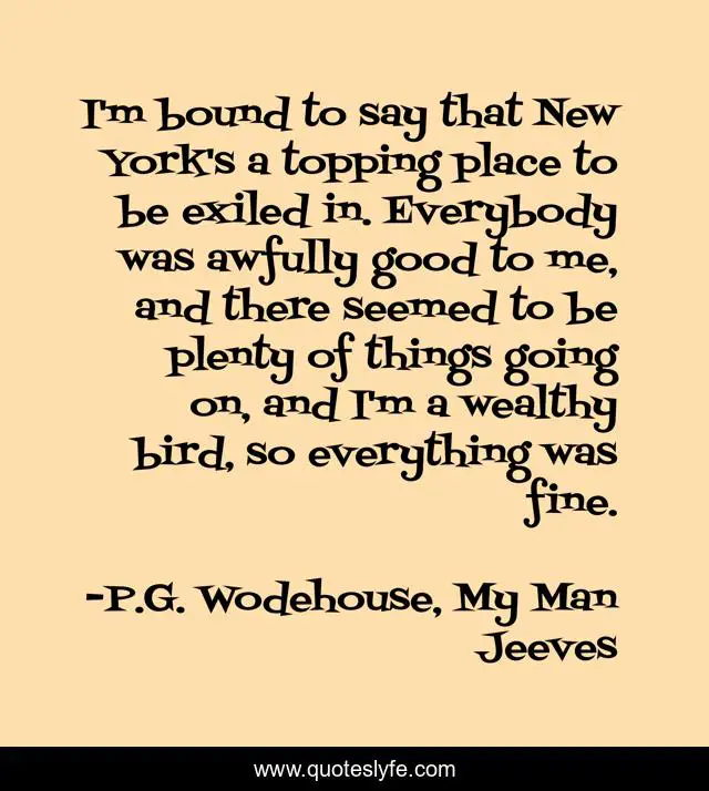 This page presents the quote "I'm bound to say that New York's a topping place to be exiled in. Everybody was awfully good to me, and there seemed to be plenty of things going on, and I'm a wealthy bird, so everything was fine.". Author of this quote is P.G. Wodehouse, My Man Jeeves. .