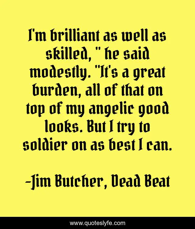 This page presents the quote "I'm brilliant as well as skilled, " he said modestly. "It's a great burden, all of that on top of my angelic good looks. But I try to soldier on as best I can.". Author of this quote is Jim Butcher, Dead Beat. This quote is about carlos-ramirez, humor, vanity,.
