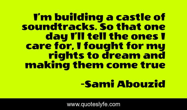 This page presents the quote "I’m building a castle of soundtracks. So that one day I’ll tell the ones I care for, I fought for my rights to dream and making them come true". Author of this quote is Sami Abouzid. This quote is about love, affection,.
