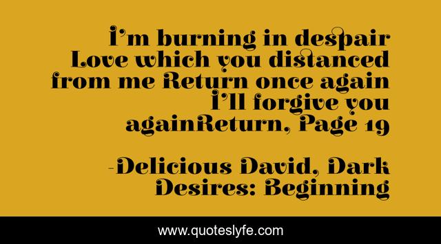 This page presents the quote "I’m burning in despair Love which you distanced from me Return once again I’ll forgive you againReturn, Page 19". Author of this quote is Delicious David, Dark Desires: Beginning. This quote is about poetry-of-life, poetry, romance, yearning, poem-poetry-poet, erotica-romance, erotic-fantasy,.
