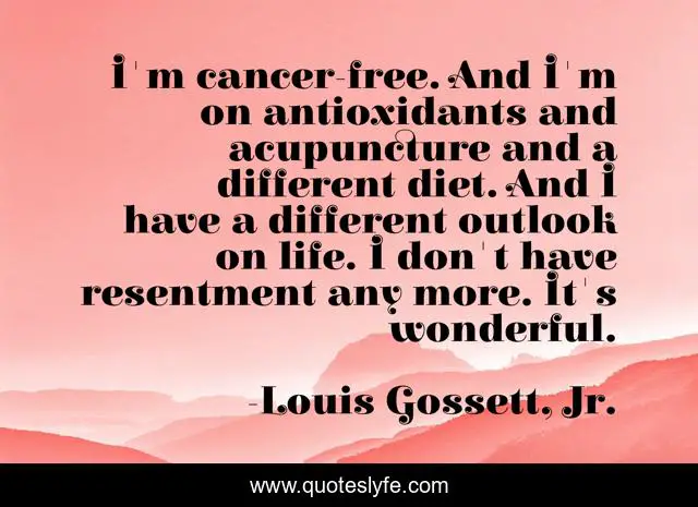 This page presents the quote "I'm cancer-free. And I'm on antioxidants and acupuncture and a different diet. And I have a different outlook on life. I don't have resentment any more. It's wonderful.". Author of this quote is Louis Gossett, Jr.. This quote is about life, wonderful, different,.