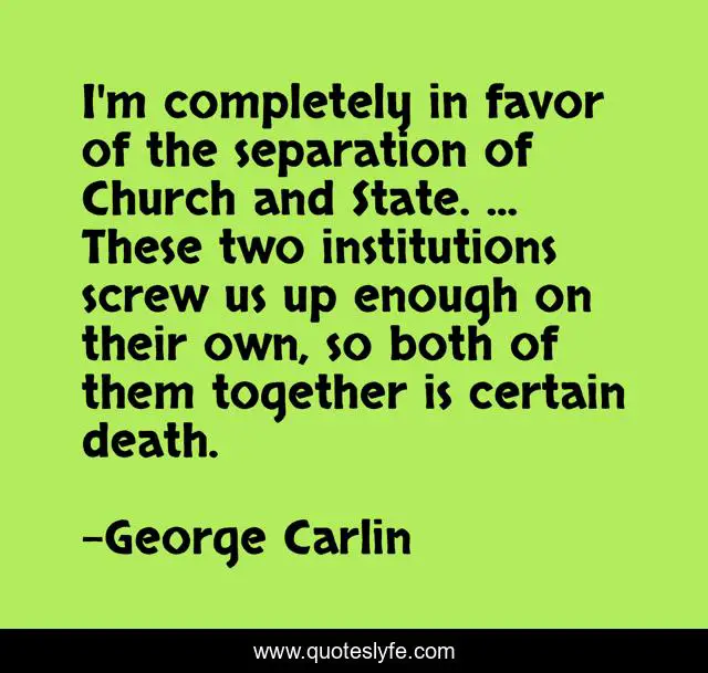 This page presents the quote "I'm completely in favor of the separation of Church and State. ... These two institutions screw us up enough on their own, so both of them together is certain death.". Author of this quote is George Carlin. This quote is about politics, organized-religion, religion,.