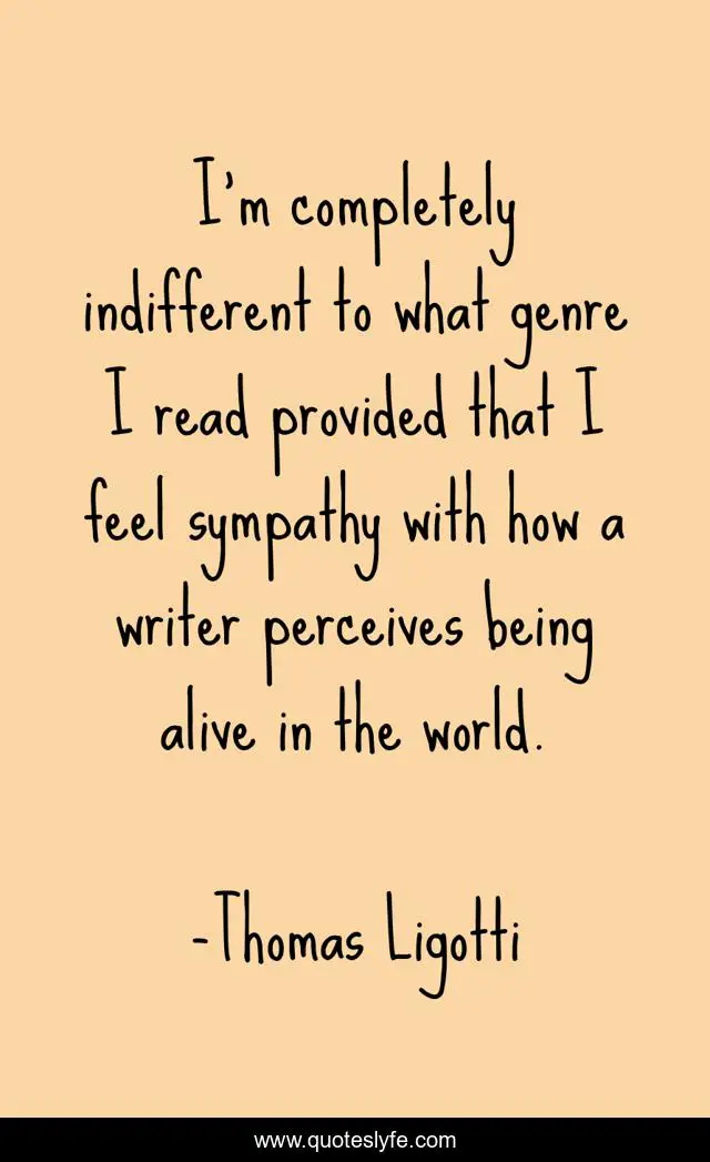This page presents the quote "I'm completely indifferent to what genre I read provided that I feel sympathy with how a writer perceives being alive in the world.". Author of this quote is Thomas Ligotti. This quote is about feel, world, alive,.