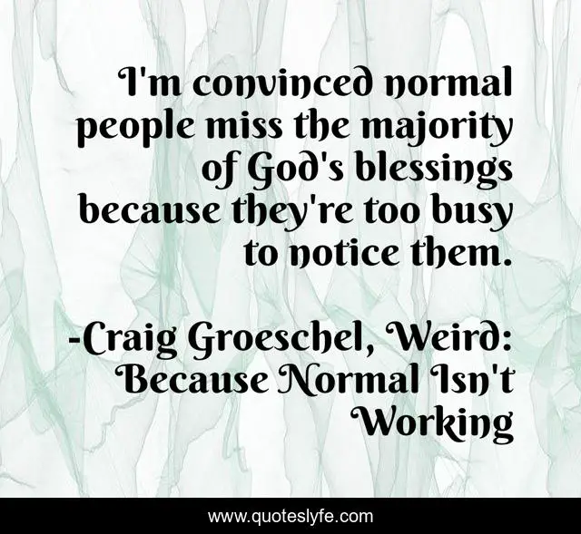This page presents the quote "I'm convinced normal people miss the majority of God's blessings because they're too busy to notice them.". Author of this quote is Craig Groeschel, Weird: Because Normal Isn't Working. This quote is about too-busy, notice, because, majority, of, they-re, them, normal-people, god-s,.
