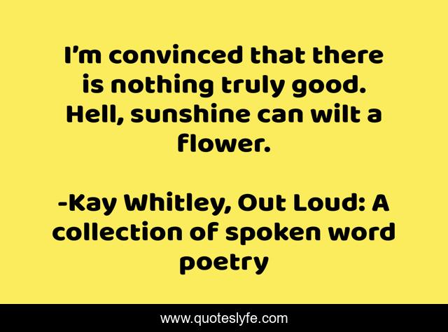 This page presents the quote "I’m convinced that there is nothing truly good. Hell, sunshine can wilt a flower.". Author of this quote is Kay Whitley, Out Loud: A collection of spoken word poetry. This quote is about bad, good, sunshine, perspective, truth,.