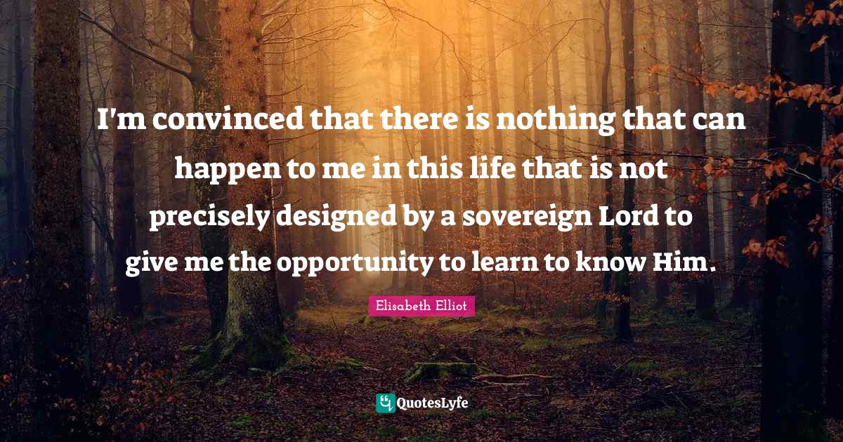 This page presents the quote "I'm convinced that there is nothing that can happen to me in this life that is not precisely designed by a sovereign Lord to give me the opportunity to learn to know Him.". Author of this quote is Elisabeth Elliot. This quote is about give me, lord, sovereign, convinced, giving, opportunities to learn, this life, opportunity,.