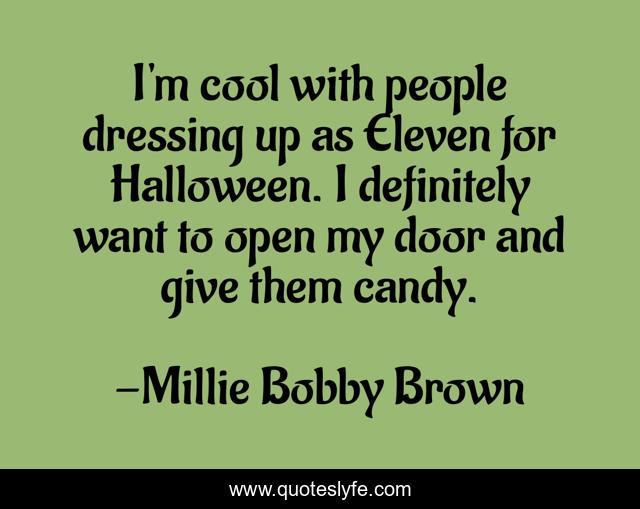 This page presents the quote "I'm cool with people dressing up as Eleven for Halloween. I definitely want to open my door and give them candy.". Author of this quote is Millie Bobby Brown. This quote is about halloween, door, people,.
