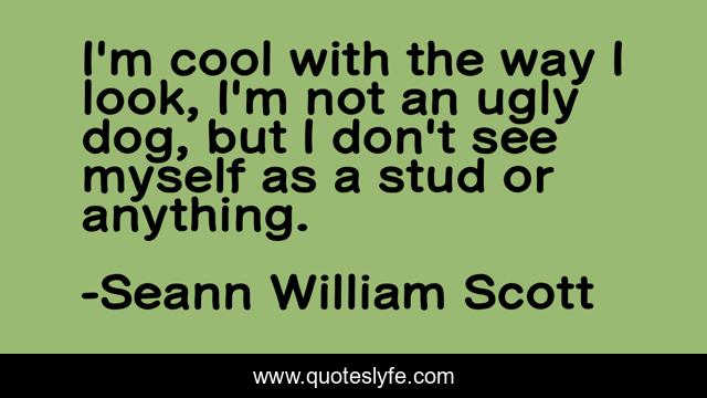 This page presents the quote "I'm cool with the way I look, I'm not an ugly dog, but I don't see myself as a stud or anything.". Author of this quote is Seann William Scott. This quote is about ugly, myself, dog,.