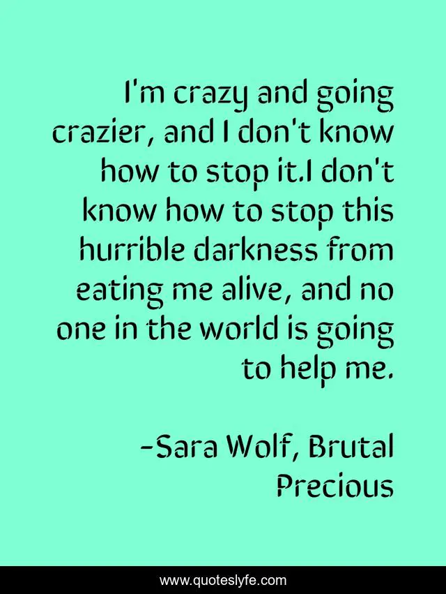 This page presents the quote "I'm crazy and going crazier, and I don't know how to stop it.I don't know how to stop this hurrible darkness from eating me alive, and no one in the world is going to help me.". Author of this quote is Sara Wolf, Brutal Precious. This quote is about darkness, craziness,.