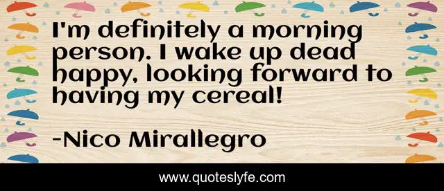 This page presents the quote "I'm definitely a morning person. I wake up dead happy, looking forward to having my cereal!". Author of this quote is Nico Mirallegro. This quote is about looking forward, happy,.