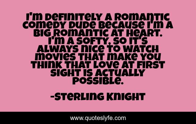 This page presents the quote "I'm definitely a romantic comedy dude because I'm a big romantic at heart. I'm a softy, so it's always nice to watch movies that make you think that love at first sight is actually possible.". Author of this quote is Sterling Knight. This quote is about heart, love, romantic, affection,.