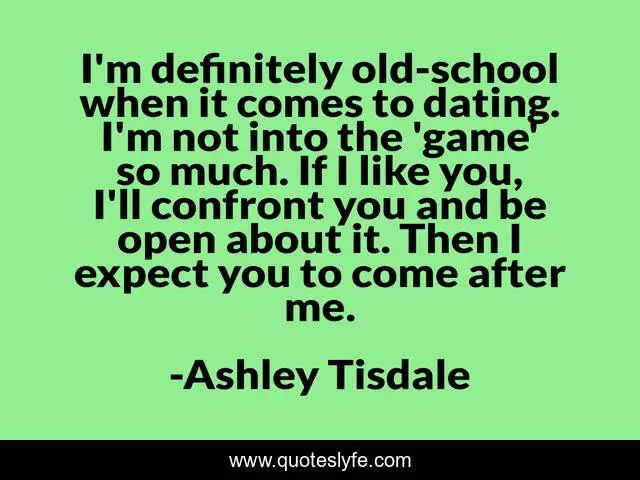 This page presents the quote "I'm definitely old-school when it comes to dating. I'm not into the 'game' so much. If I like you, I'll confront you and be open about it. Then I expect you to come after me.". Author of this quote is Ashley Tisdale. This quote is about me, game,.