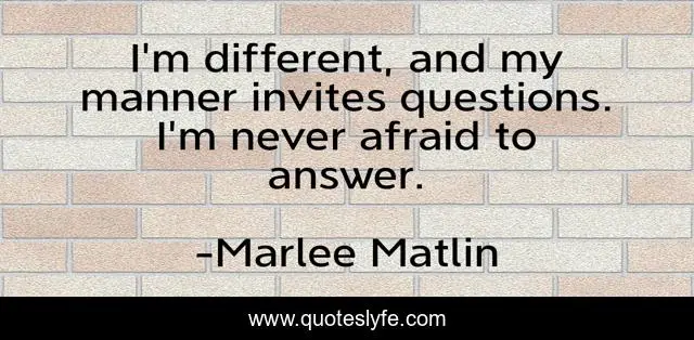This page presents the quote "I'm different, and my manner invites questions. I'm never afraid to answer.". Author of this quote is Marlee Matlin. This quote is about different, questions,.