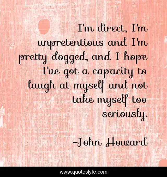 This page presents the quote "I'm direct, I'm unpretentious and I'm pretty dogged, and I hope I've got a capacity to laugh at myself and not take myself too seriously.". Author of this quote is John Howard. This quote is about myself, seriously, laugh,.