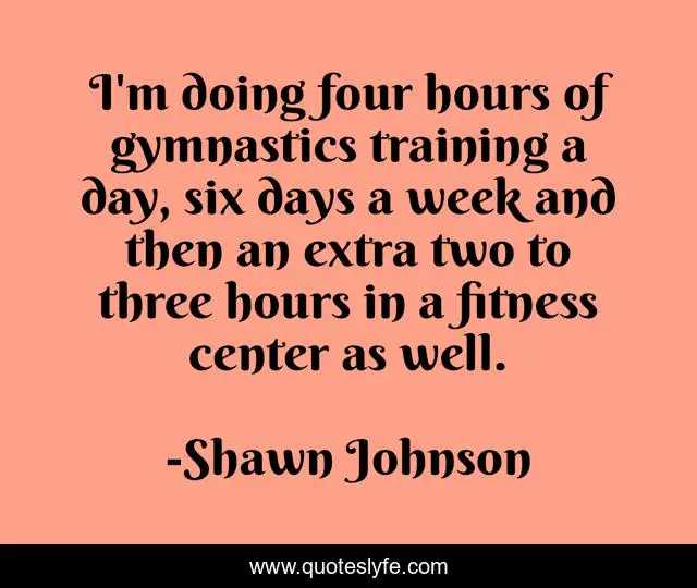 This page presents the quote "I'm doing four hours of gymnastics training a day, six days a week and then an extra two to three hours in a fitness center as well.". Author of this quote is Shawn Johnson. This quote is about week, training, day,.