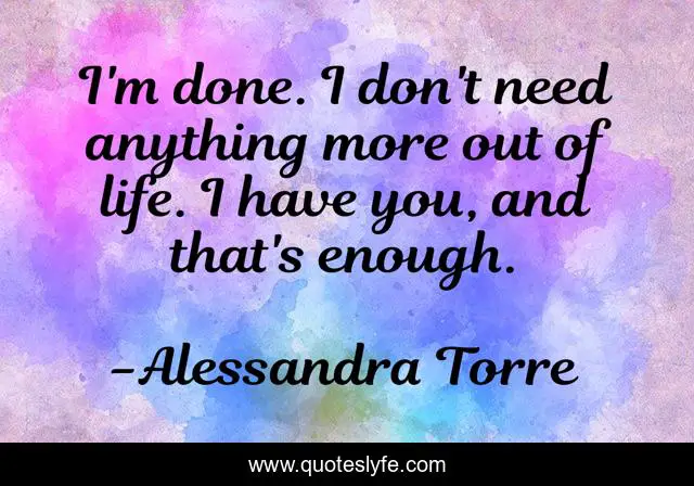 This page presents the quote "I'm done. I don't need anything more out of life. I have you, and that's enough.". Author of this quote is Alessandra Torre. This quote is about relationships, true-love, love, relationship, soul-mates, love-for-him, marriage, affection,.