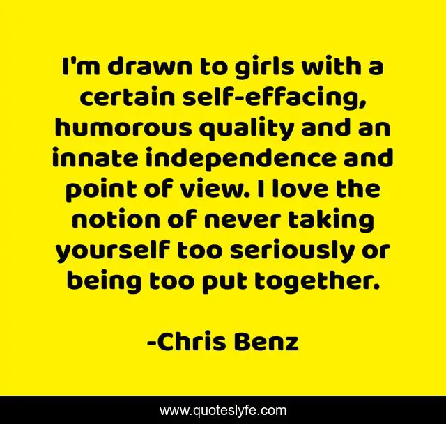 This page presents the quote "I'm drawn to girls with a certain self-effacing, humorous quality and an innate independence and point of view. I love the notion of never taking yourself too seriously or being too put together.". Author of this quote is Chris Benz. This quote is about love, quality, together, affection,.