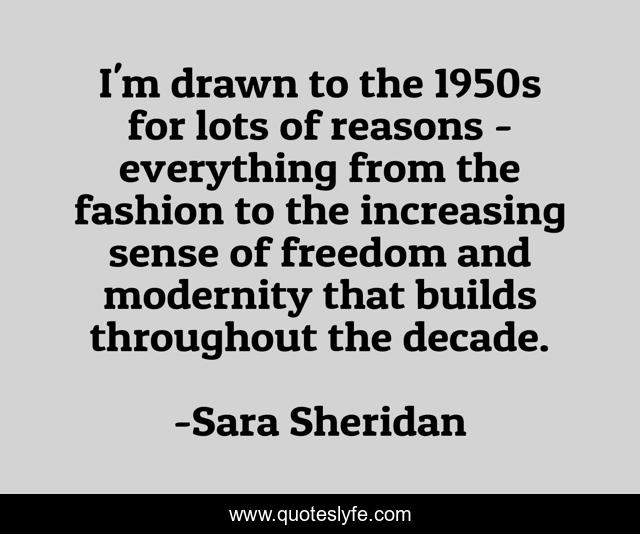 This page presents the quote "I'm drawn to the 1950s for lots of reasons - everything from the fashion to the increasing sense of freedom and modernity that builds throughout the decade.". Author of this quote is Sara Sheridan. This quote is about fashion, 1950s, era, freedom, modernity, fifties, decade, history,.