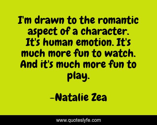 This page presents the quote "I'm drawn to the romantic aspect of a character. It's human emotion. It's much more fun to watch. And it's much more fun to play.". Author of this quote is Natalie Zea. This quote is about fun, play, character,.