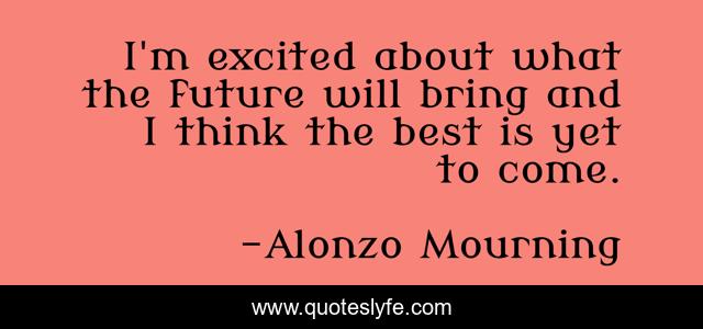 This page presents the quote "I'm excited about what the future will bring and I think the best is yet to come.". Author of this quote is Alonzo Mourning. This quote is about bring, think, best,.