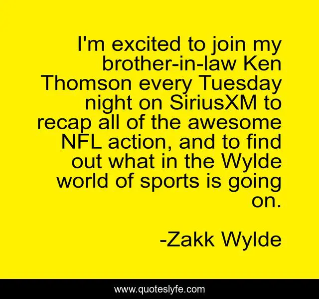 This page presents the quote "I'm excited to join my brother-in-law Ken Thomson every Tuesday night on SiriusXM to recap all of the awesome NFL action, and to find out what in the Wylde world of sports is going on.". Author of this quote is Zakk Wylde. This quote is about action, world, night,.
