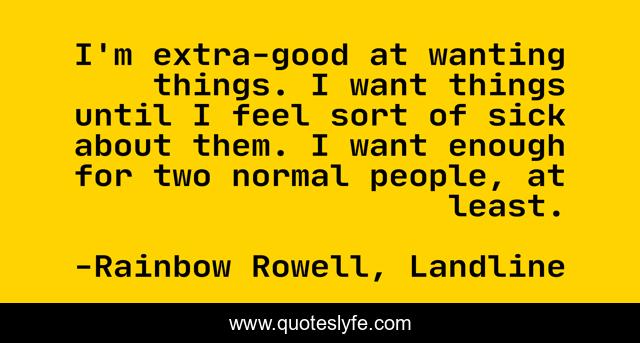 This page presents the quote "I'm extra-good at wanting things. I want things until I feel sort of sick about them. I want enough for two normal people, at least.". Author of this quote is Rainbow Rowell, Landline. This quote is about desire, relationships, self-awareness, wanting, love, affection,.