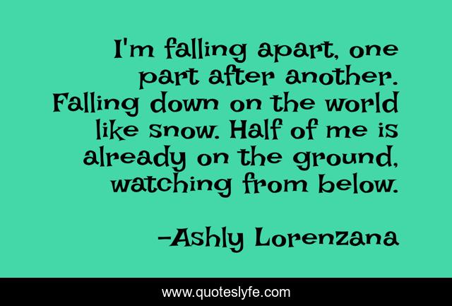 This page presents the quote "I'm falling apart, one part after another. Falling down on the world like snow. Half of me is already on the ground, watching from below.". Author of this quote is Ashly Lorenzana. This quote is about rhyming, winter, falling-apart, bleakness, poetry, snow, sadness, coldness, hopelessness,.