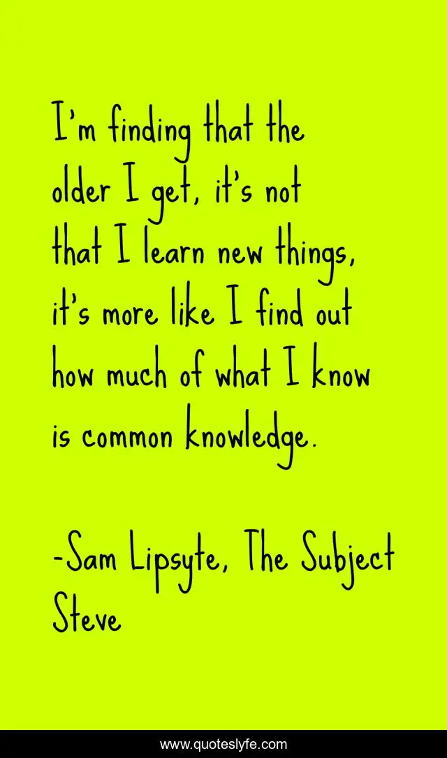 This page presents the quote "I'm finding that the older I get, it's not that I learn new things, it's more like I find out how much of what I know is common knowledge.". Author of this quote is Sam Lipsyte, The Subject Steve. This quote is about aging, knowledge, learning,.
