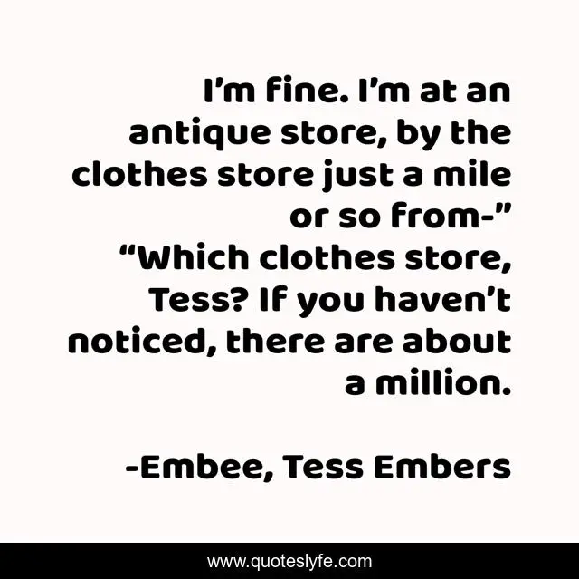This page presents the quote "I’m fine. I’m at an antique store, by the clothes store just a mile or so from-” “Which clothes store, Tess? If you haven’t noticed, there are about a million.". Author of this quote is Embee, Tess Embers. This quote is about paris, travel, lost,.