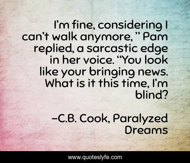 This page presents the quote "I’m fine, considering I can’t walk anymore, ” Pam replied, a sarcastic edge in her voice. “You look like your bringing news. What is it this time, I’m blind?". Author of this quote is C.B. Cook, Paralyzed Dreams. This quote is about blind, walking, humor, sarcasm, quotes, paralyzed,.