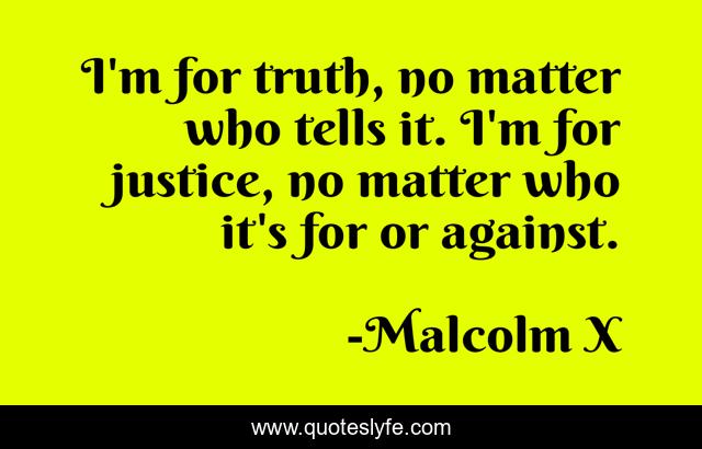 This page presents the quote "I'm for truth, no matter who tells it. I'm for justice, no matter who it's for or against.". Author of this quote is Malcolm X. This quote is about justice, matter, against,.