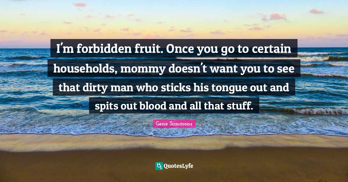 This page presents the quote "I'm forbidden fruit. Once you go to certain households, mommy doesn't want you to see that dirty man who sticks his tongue out and spits out blood and all that stuff.". Author of this quote is Gene Simmons. This quote is about men, blood, stuff, sticks, tongue, naughty, want, certain, dirty,.