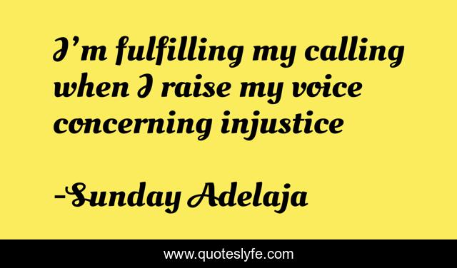 This page presents the quote "I’m fulfilling my calling when I raise my voice concerning injustice". Author of this quote is Sunday Adelaja. This quote is about raise, fulfilling, concerning, calling, i, injustice, voice, my,.