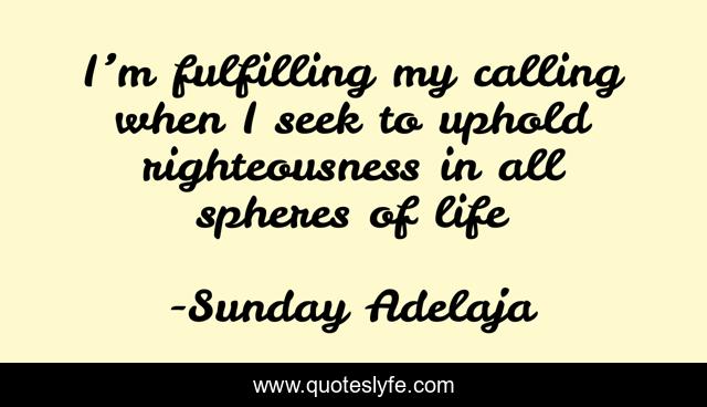 This page presents the quote "I’m fulfilling my calling when I seek to uphold righteousness in all spheres of life". Author of this quote is Sunday Adelaja. This quote is about life, righteousness, uphold, i, my, all, calling, spheres, fulilling,.