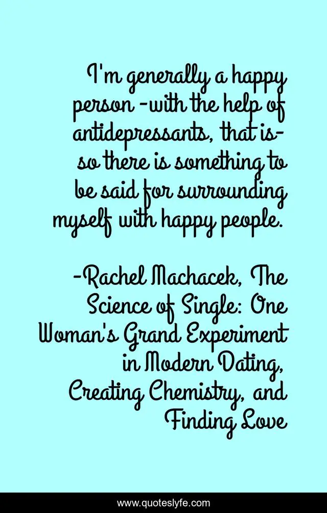 "Rachel Machacek, The Science of Single: One Woman's Grand Experiment in Modern Dating, Creating Chemistry, and Finding Love Quotes." Quoteslyfe.com, 2025. Fri. 05 Dec. 2025. <https://www.quoteslyfe.com/quote/I-m-generally-a-happy-person-with-16617>.
