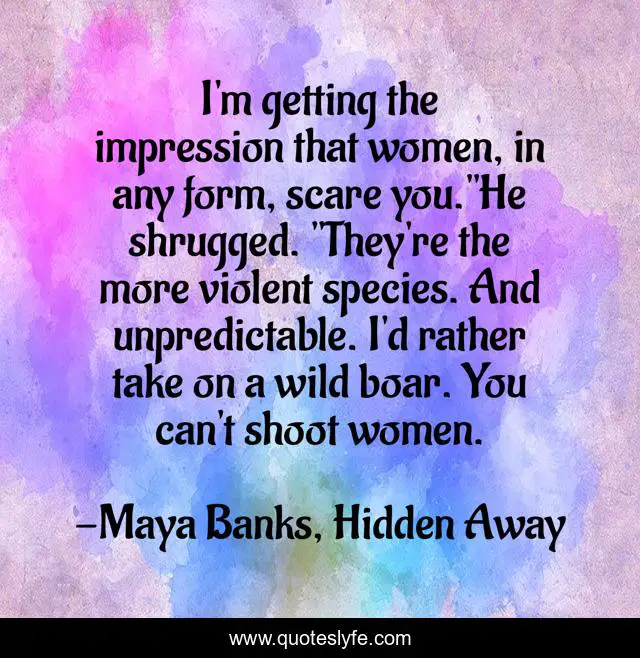 This page presents the quote "I'm getting the impression that women, in any form, scare you."He shrugged. "They're the more violent species. And unpredictable. I'd rather take on a wild boar. You can't shoot women.". Author of this quote is Maya Banks, Hidden Away. This quote is about sarah, men, garreth, women,.
