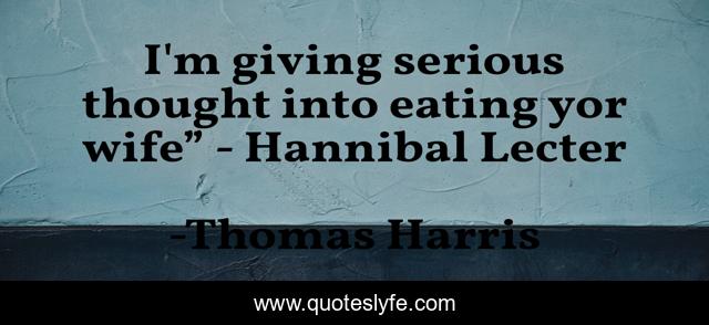 This page presents the quote "I'm giving serious thought into eating yor wife” - Hannibal Lecter". Author of this quote is Thomas Harris. This quote is about horror, suspense, thriller,.
