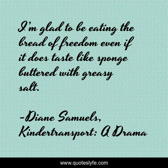 This page presents the quote "I’m glad to be eating the bread of freedom even if it does taste like sponge buttered with greasy salt.". Author of this quote is Diane Samuels, Kindertransport: A Drama. This quote is about gratitude, england, rescue, humour, freedom, wwii, children,.