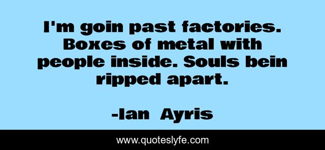This page presents the quote "I'm goin past factories. Boxes of metal with people inside. Souls bein ripped apart.". Author of this quote is Ian Ayris. This quote is about dark, factories, industrialisation,.