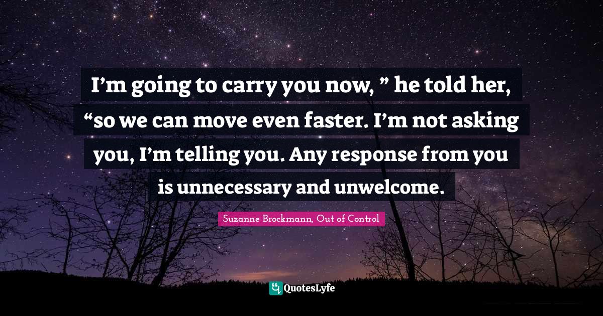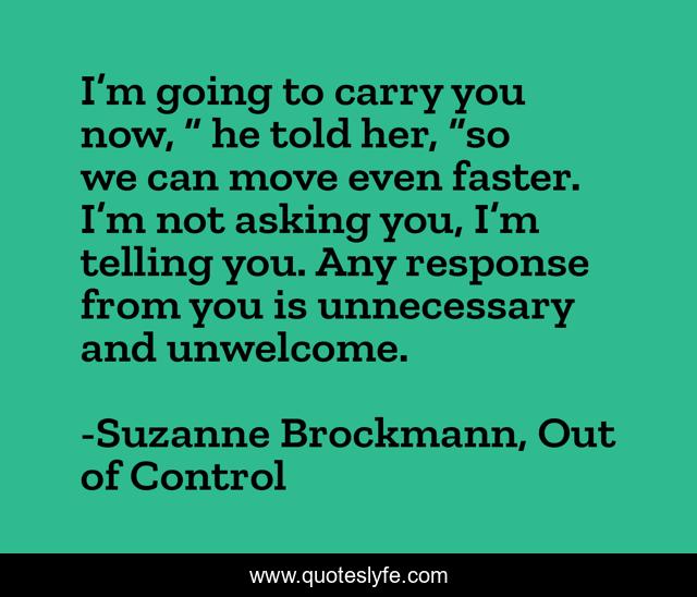 This page presents the quote "I’m going to carry you now, ” he told her, “so we can move even faster. I’m not asking you, I’m telling you. Any response from you is unnecessary and unwelcome.". Author of this quote is Suzanne Brockmann, Out of Control. This quote is about romance, romantic-suspense,.