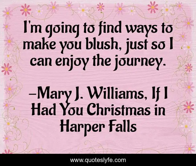 This page presents the quote "I'm going to find ways to make you blush, just so I can enjoy the journey.". Author of this quote is Mary J. Williams, If I Had You Christmas in Harper Falls. This quote is about small-town-romance, holiday-romance, contemporary-romance,.
