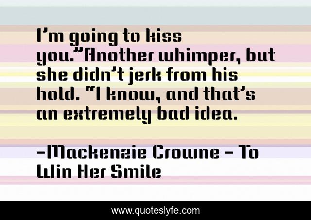 This page presents the quote "I’m going to kiss you.”Another whimper, but she didn’t jerk from his hold. “I know, and that’s an extremely bad idea.". Author of this quote is Mackenzie Crowne - To Win Her Smile. This quote is about romance, football, playersromance, contemporary-romance, sports-romance,.