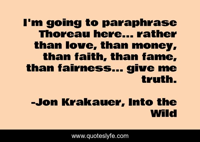 This page presents the quote "I'm going to paraphrase Thoreau here... rather than love, than money, than faith, than fame, than fairness... give me truth.". Author of this quote is Jon Krakauer, Into the Wild. This quote is about enthusiasm, inspirational,.