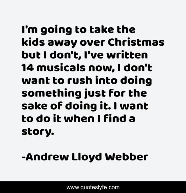 This page presents the quote "I'm going to take the kids away over Christmas but I don't, I've written 14 musicals now, I don't want to rush into doing something just for the sake of doing it. I want to do it when I find a story.". Author of this quote is Andrew Lloyd Webber. .
