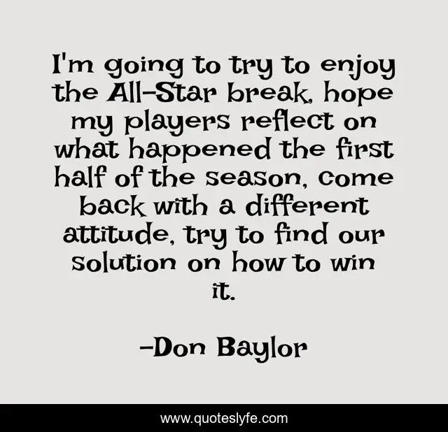 This page presents the quote "I'm going to try to enjoy the All-Star break, hope my players reflect on what happened the first half of the season, come back with a different attitude, try to find our solution on how to win it.". Author of this quote is Don Baylor. This quote is about enjoy, win, hope,.