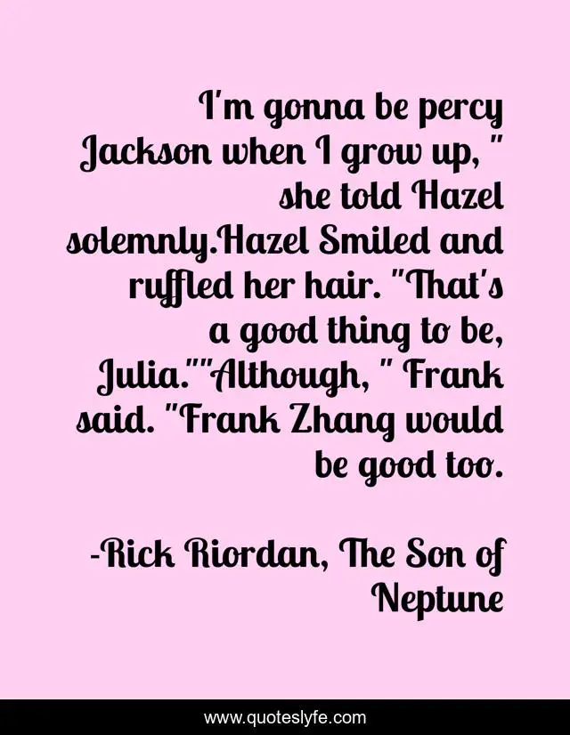 This page presents the quote "I'm gonna be percy Jackson when I grow up, " she told Hazel solemnly.Hazel Smiled and ruffled her hair. "That's a good thing to be, Julia.""Although, " Frank said. "Frank Zhang would be good too.". Author of this quote is Rick Riordan, The Son of Neptune. This quote is about hero, frank, hazel, percy, humor, inspirational, enthusiasm, comedy,.