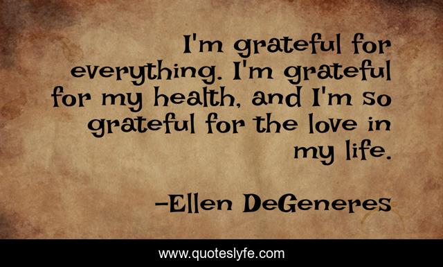 This page presents the quote "I'm grateful for everything. I'm grateful for my health, and I'm so grateful for the love in my life.". Author of this quote is Ellen DeGeneres. This quote is about life, love, grateful, affection,.